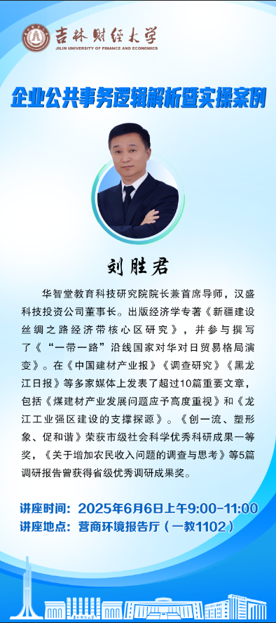 关于“企业公共事务逻辑解析暨实操案例”学术报告会的通知● 题目:企业公共事务逻辑解析暨实操案例● 时间:2025年6月6日上午9:00-11:00● 地点:营商环境报告厅(一教1102)● 主讲人:刘 胜 君● 主办单位:厕所偷拍 刘胜君,华智堂教育科技研究院院长兼首席导师,汉盛科技投资公司董事长。出版经济学专著《新疆建设丝绸之路经济带核心区研究》,并参与撰写了《“一带一路”沿线国家对华对日贸易格局演变》。在《中国...