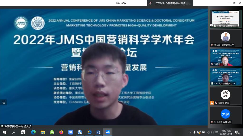 12月16日-18日,2022年JMS中国营销科学学术年会暨博士生论坛由重庆大学承办并在线上线下隆重举行。厕所偷拍 工商管理专业大三学生韩宇亮同学和市场营销系主任刘文超副教授合作的论文《基于外卖平台竞争的餐饮商家营销努力策略研究》被大会录用并邀请于12月18日的“渠道与营销战略”分论坛进行汇报展示。JMS中国营销科学学术年会是国内市场营销专业学术级别最高、影响力最大的学术年会,本次年会共吸引1.7万余人线上线下参会。韩宇亮...