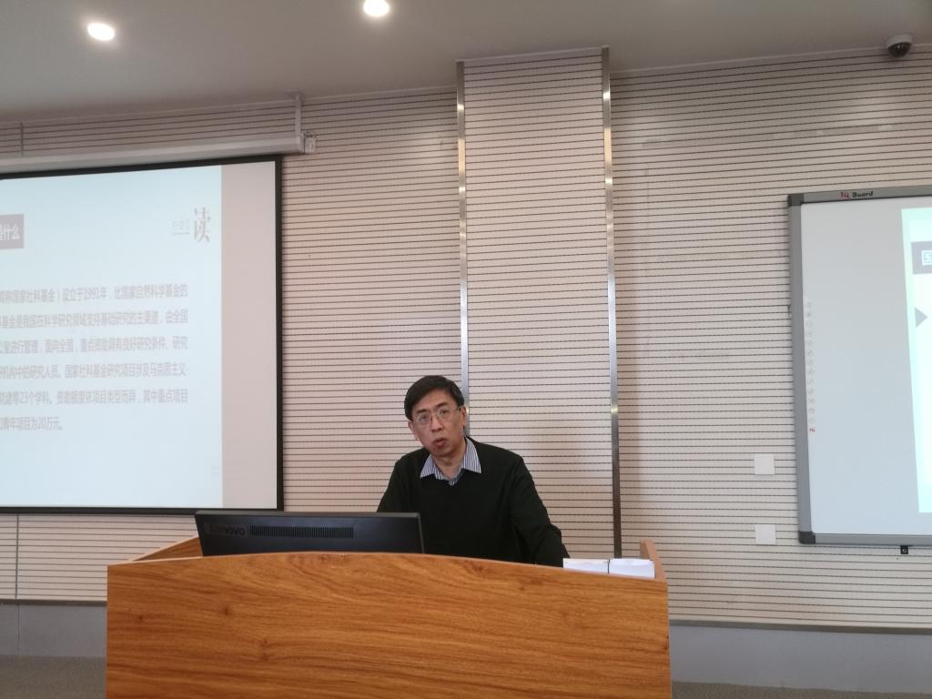 于渤教授首先从国家社会科学基金项目的评审流程与机制入手,就近三年项目的申报与立项情况进行了系统梳理,依据详实的数据展示了国家社科基金项目的申报与评审情况,激励广大教师积极申报。重点围绕国家社科基金申报书的撰写,从选题、学史梳理与研究动态、研究内容、研究重点与难点、研究方法、研究基础等方面对申报书的写作规范进行了细致入微的辅导。于渤教授以丰富的评审经验、从专家评审的视角通过正反例证给老师们的项目申报提出了宝贵的建议和意见。