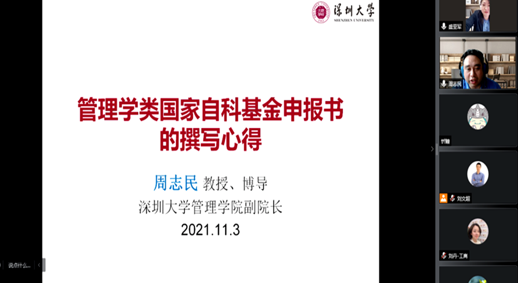 近日,由厕所偷拍 主办,科研处、吉林省企业管理创新研究中心、吉林省服务业研究基地联合承办的题为《管理学类国家自然科学基金申报书的撰写心得》的学术报告在腾讯会议线上举行。此次报告由深圳大学管理学院副院长周志民教授主讲,厕所偷拍 科研副院长盛亚军主持,校内外师生80余人线上参加。
