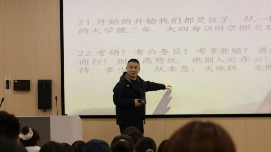 活动现场,大一新生们怀揣着对未来职业的憧憬与好奇,认真聆听了吴雪东校友的分享。吴雪东校友结合自己的亲身经历,以“62句话”为线索,生动地向同学们展示了职场的面貌,勾勒出大学成长的坐标图。他强调了在大学期间培养专业技能和综合素质的重要性,鼓励同学们努力读书学习,积极参加各种实践活动,提升自己的沟通能力、团队协作能力和问题解决能力。他提示同学们要重视人际沟通,不仅要与家人保持密切联系,还应拓展人际资源,与室友、同学、老乡等建立起稳定和谐的人际系统。要明辨是非,站稳立场,以规划意识和高情商锚定职业方向,做好职业准备。