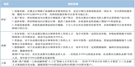 补贴政策。各省市为吸引人才,推出人才引进计划。对持有注册会计师证书的人才给予相应的政策福利和补贴。上海、成都、西安等地均推出针对注册会计师的福利政策。