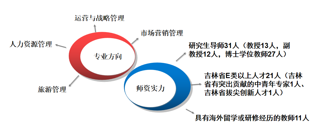 本专业经过多年的积淀,目前已形成了运营与战略管理、市场营销管理、旅游管理、人力资源管理4个稳定的研究方向。本学位点现有研究生导师31人,副教授以上教师占比81%,其中教授13人,副教授12人;研究生导师中博士学位教师27人,占比87%。吉林省E类以上人才21人,其中吉林省有突出贡献的中青年专家1人、吉林省拔尖创新人才1人。具备海外留学或研修经历的教师11人。
