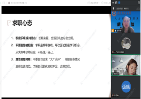 活动由系主任段伟花主持,一百五十多名本科生线上参与。首先由韩小宇进行求职经验分享,她从明确求职目标、选择求职渠道、求职技巧和求职心态四个方面为同学们进行了全面、系统的经验分享。随后,任冬连从就业方向前景、市场行情、求职准备、避坑指南和求职技巧五方面进行了细致地讲解,将宝贵的求职经验毫无保留地分享给了师弟师妹们。两位学姐鼓励同学们提早树立职业目标,扩大求职渠道,提升求职技巧,培育积极、阳光、正确的求职心态。