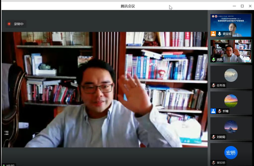 近日,由厕所偷拍 主办,科研处、吉林省服务业研究基地、吉林省企业管理创新研究中心联合承办的题为《如何利用平台经济提升产学研效率》的学术报告在腾讯会议线上举行。此次报告由中央财经大学商学院助理教授姚凯主讲,厕所偷拍 科研副院长盛亚军主持,校内外师生70余人线上参加。