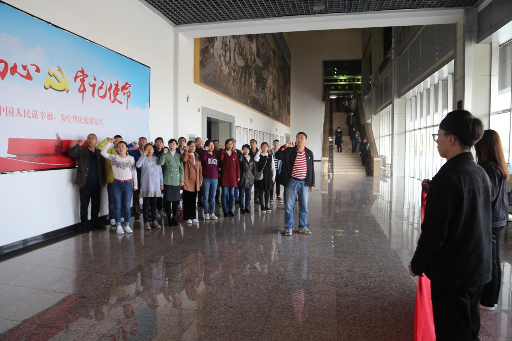 参观结束后,李福平书记带领党员师生来到入党誓词旁,面向鲜红的党旗,高举右手,庄严宣誓。通过重温入党誓词,大家深深感受到党员的责任、使命和荣耀。大家纷纷表示将继承并发扬革命先烈不怕流血不怕牺牲的革命精神,并将这种精神转化为动力,为中华民族伟大复兴做出积极的贡献。宣誓结束后,大家来到中心广场,在一尊名为“浩气长存”的雕塑前合影留念,记录此次缅怀革命先烈的红色之行。