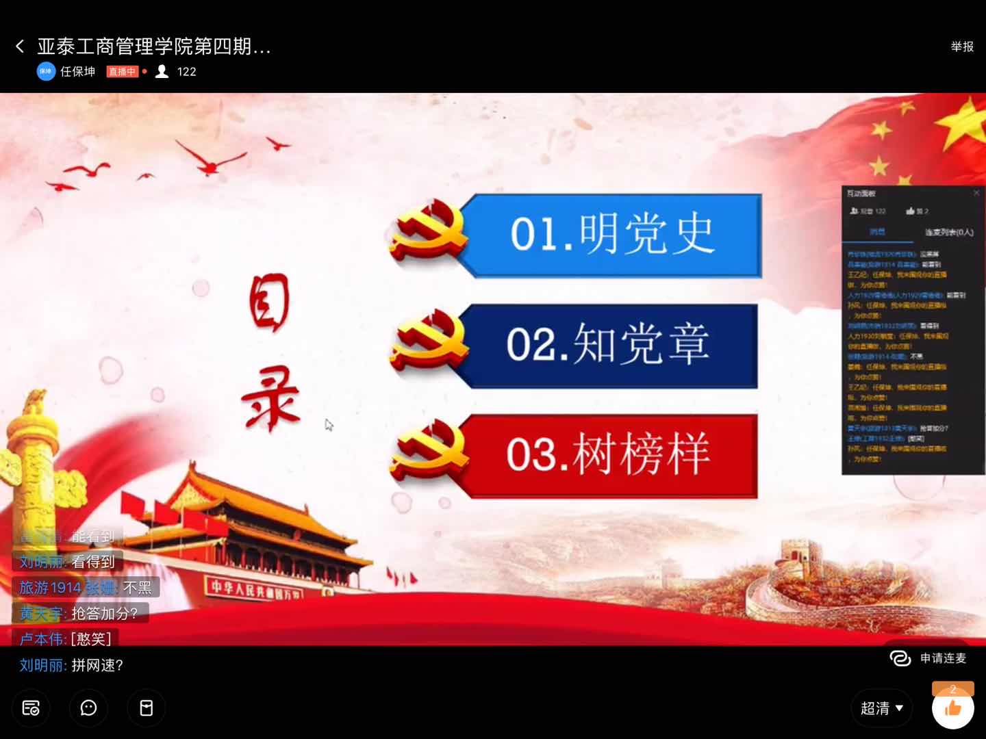 随后,由学生党支部成员任保坤同学带领学员们学习共产党的历史、《中国共产党章程》以及榜样的精神品质。过程中详细叙述了我党从诞生时的不易和艰辛,并在实践中迅速成长,直到今天依旧奋勇前行的光辉历程。在对《中国共产党章程》的学习中,采用互动的方式,让同学们积极参加,真正将党章知识融会贯通。在学习榜样精神的环节中,介绍了奋战在疫情防控一线的西城巾帼杜雪如,“疫情就是命令,防控就是责任”,西城苏溪社区妇联主席杜雪如带领巾帼志愿者全力以赴投入到抗击疫情第一线,确保辖区居民生命安全和身体健康。
