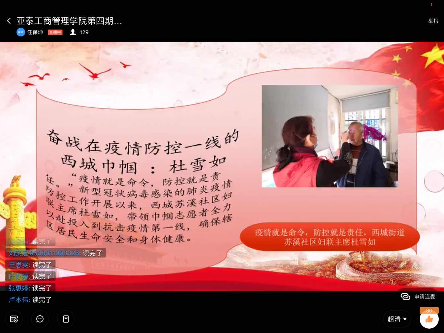 通过此次党课培训,同学们认识到了要以抗疫中“90后”英雄为榜样,担当时代责任,树立为党和国家事业奋斗终身的信仰,在党和人民最需要的地方绽放绚丽的青春。